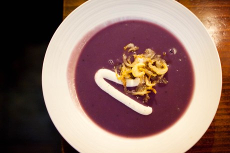 2nd Course Grand Teton Bitch Creek ESB paired with a Okinawan Sweet Potato Soup with Spiced Creme Fraiche and Fried Shallots