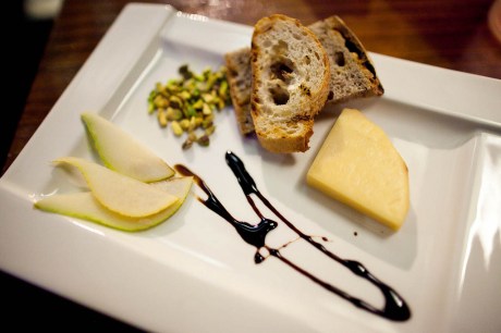 5th Course Grand Teton Bourbon Barrled Aged Double Vision on Nitro paired with Smoked Gouda, sliced Pear, Balsamic Reduction and toasted Pistachios with La Boulange Baguette and Walnut Bread