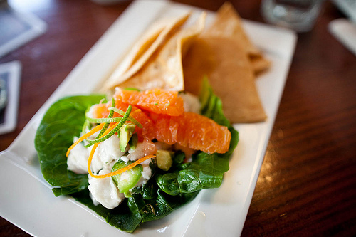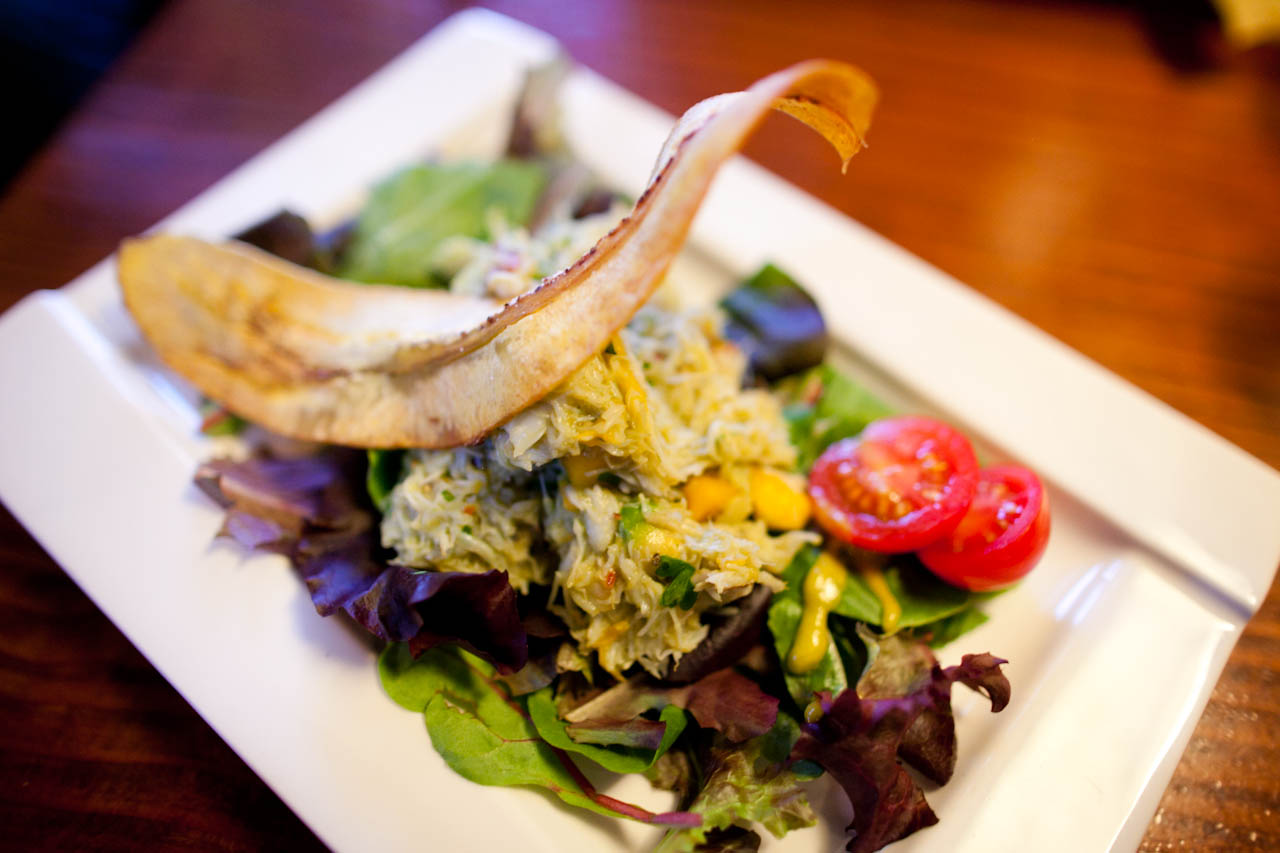 1st Course Grand Teton Sweet Grass paired with a tropical crab salad with passion fruit vinaigrette and fried plantain chips over mixed greens