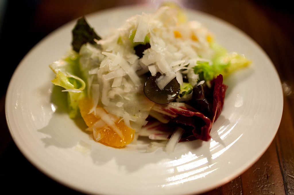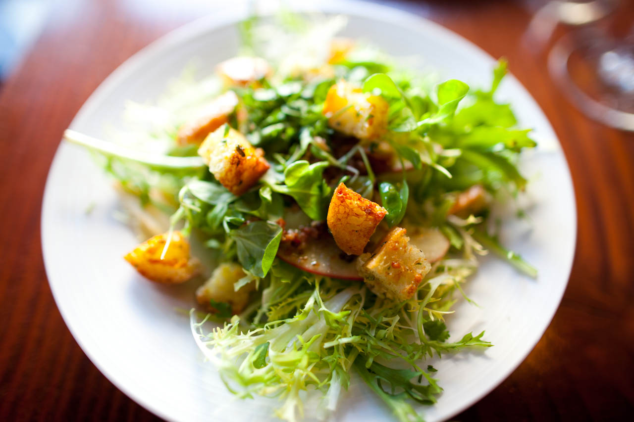 Second Course-Scarborough Farms baby frisee, local mache, house-cured bacon vinaigrette, sliced pink lady apples, fresh herbs and house-made croutons