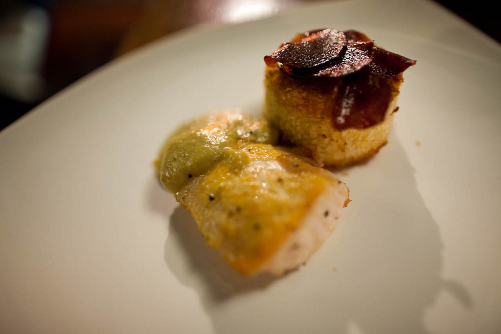 This was probably one of the most challenging beer dinners I’ve done with The Monk’s Kettle. It’s also the last one I will be doing with Monk’s. We parted ways amicably yesterday which leaves me unemployed but hopeful for my future and where it takes me which now my options are many. This was also one of the prettiest beer dinners I’ve done not because of the plate composition but the absolutely wonderful photographs Sonya Yu took of my food. Her presence at my dinners will be truly missed. I hope she will be given the opportunity to highlight the next chef at Monk’s and show everyone how talented her camera eye is. Please enjoy these photos of my food and how much fun we had creating this great beer dinner. Who knows what I will write about next but it’s going to be an interesting one. -Chef Kevin Kroger