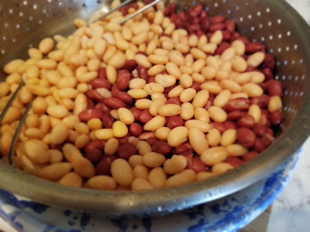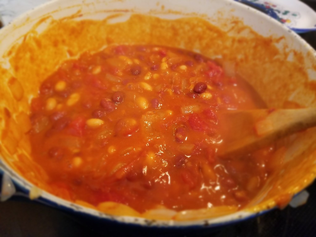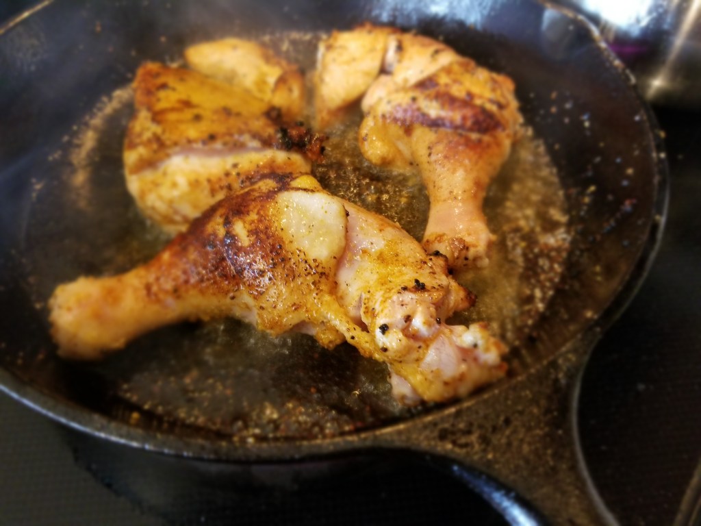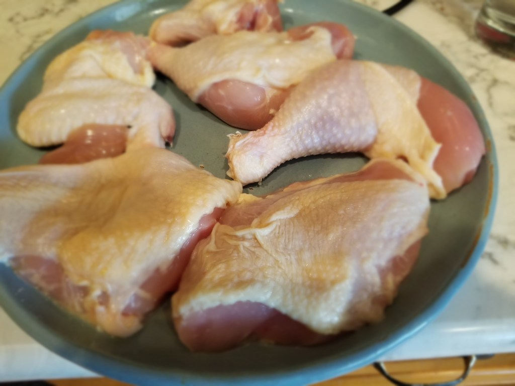 I purchased a whole Amish chicken which I deboned into quarters. Dusted the chicken with the Mojo seasoning and pan-seared it in the cast iron skillet. I transferred the chicken to the oven at 350 degrees for a half-hour and then in a heavy pot, added olive oil, and brought the heat up to high. I sauteed the onions, added garlic to sweat then deglazed with white wine. I add the beans and tomato and then slowly incorporated the paprika and salt. Adding salt early and reducing the sauce of the beans can make the beans very salty. I finished with lemon just a put aside.
