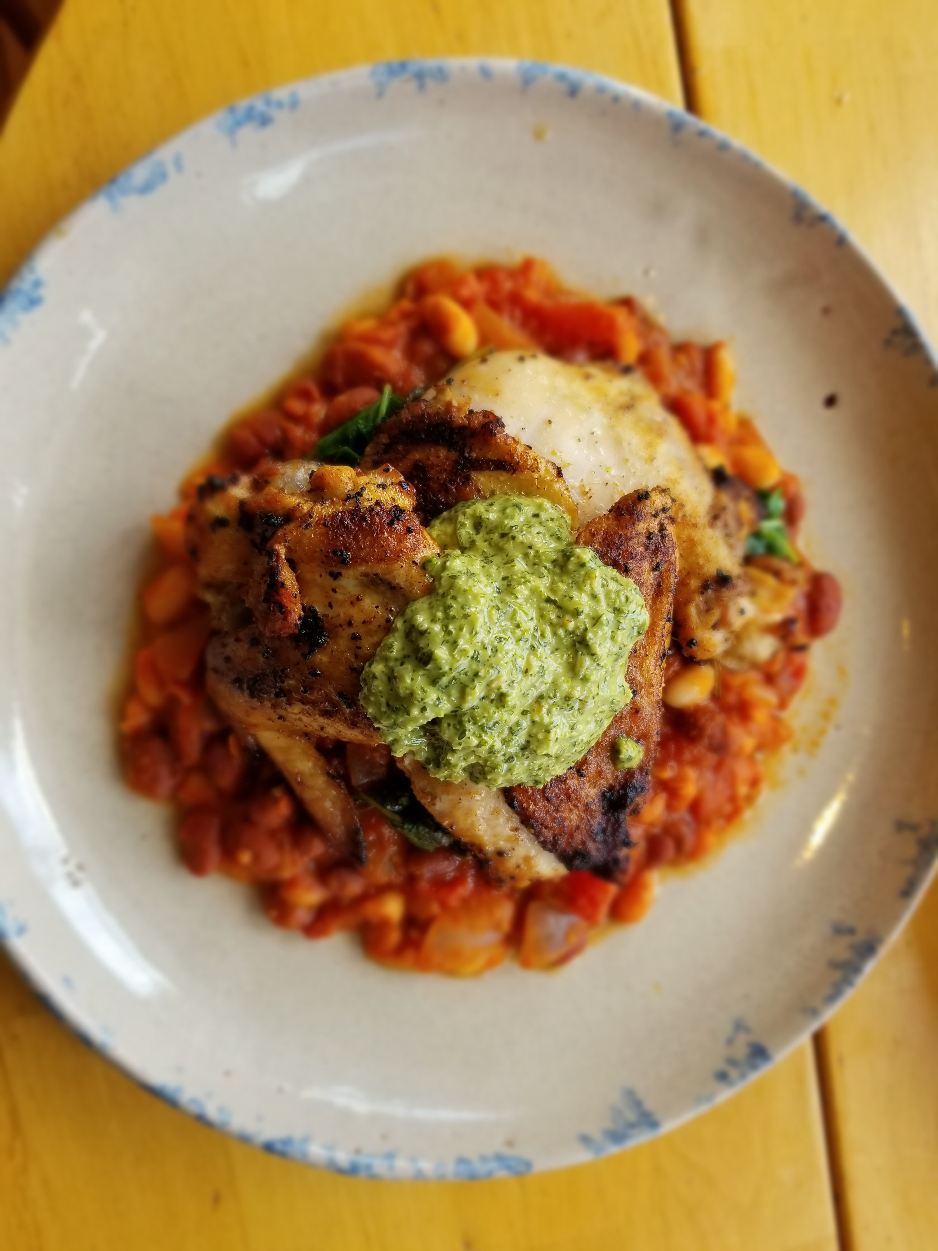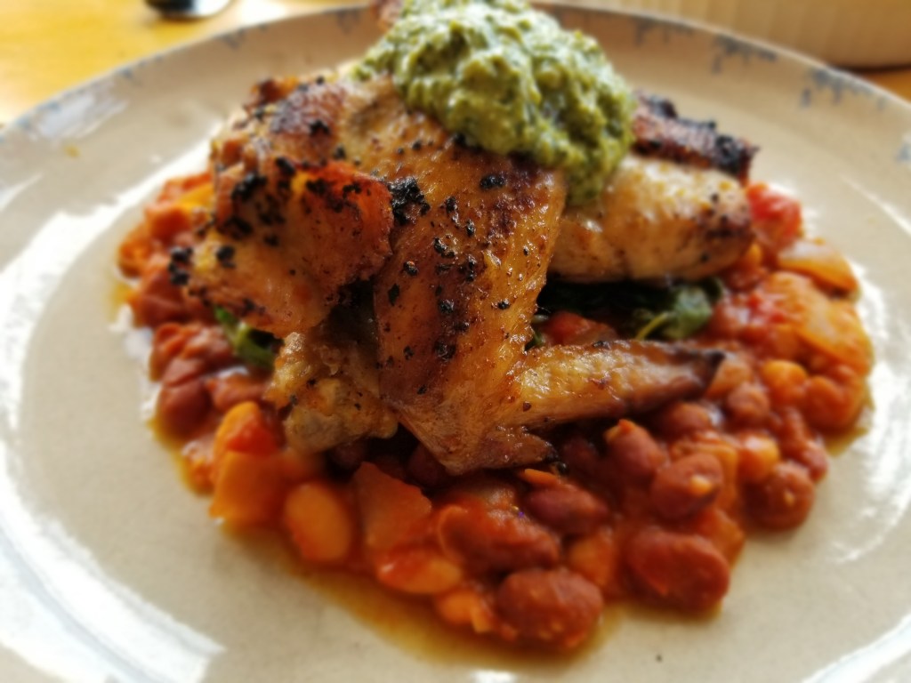 I did a quick saute of olive oil, garlic, arugula, lemon juice, and sea salt. Mounded the beans on the plate, topped with the sauteed arugula, arranged the cooked chicken over the beans and arugula, and topped it all off with Chris’s great Aji Verde sauce. He also brought a seared Halloumi cheese with mint and watermelon and the whole dinner was amazing. Cheers!