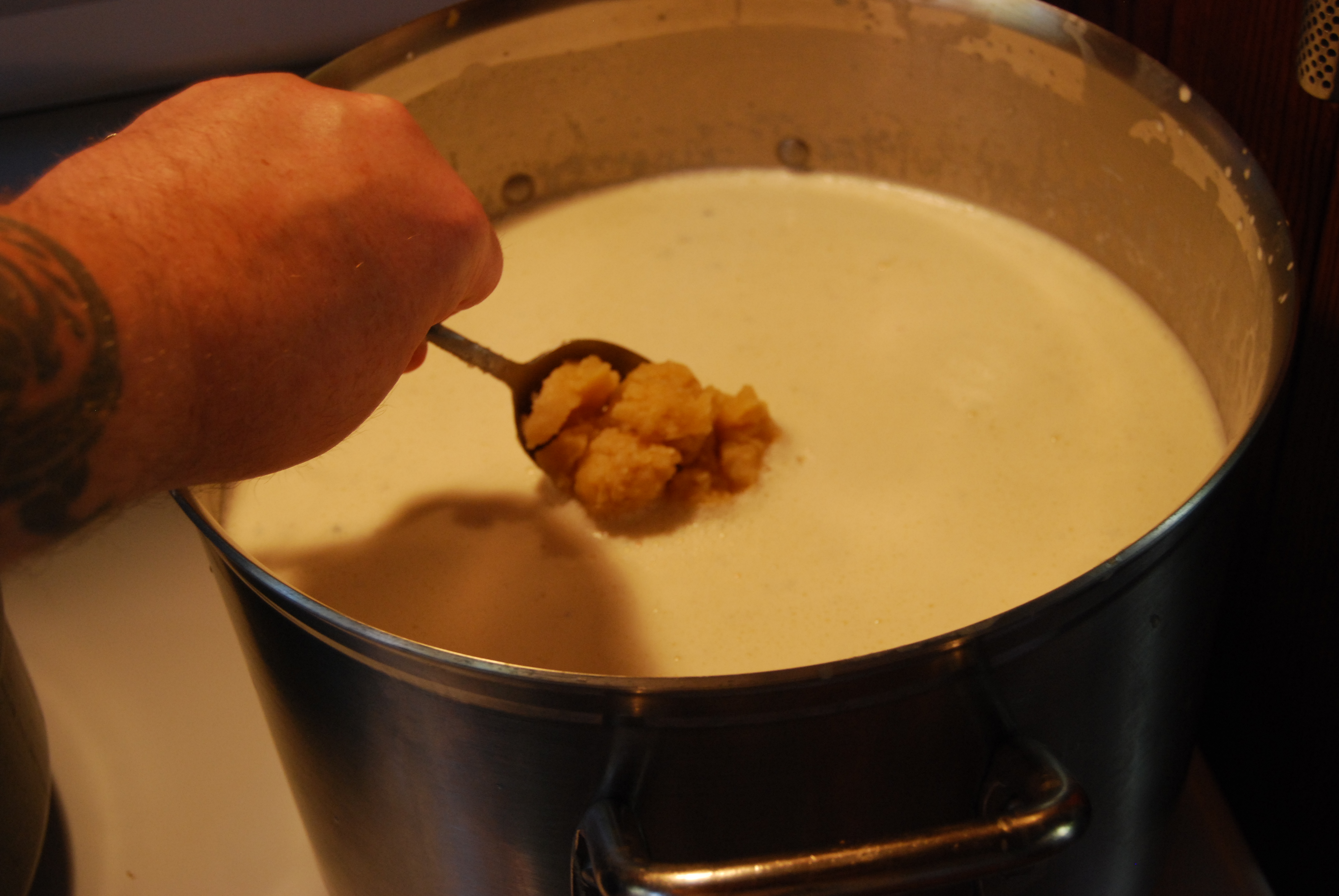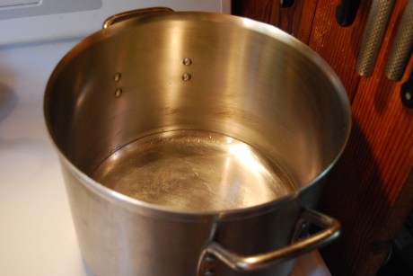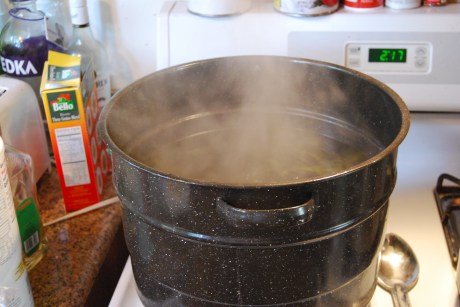 The next step is a 5 gallon stock pot. Stainless steel is the only choice for making sauces. If you use aluminum, you risk leaching aluminum into your sauce giving a metallic flavor. I was able to get an inexpensive pot at Economy Restaurant Supply in San Francisco.