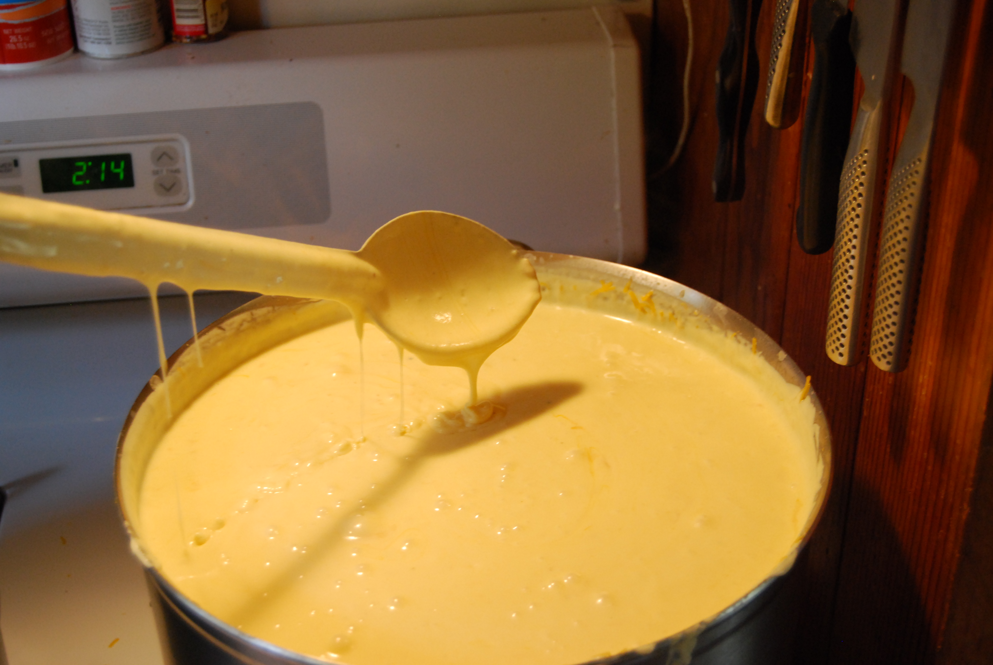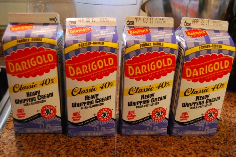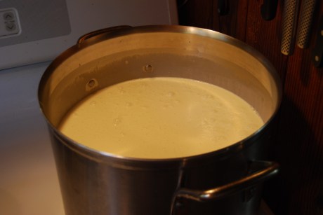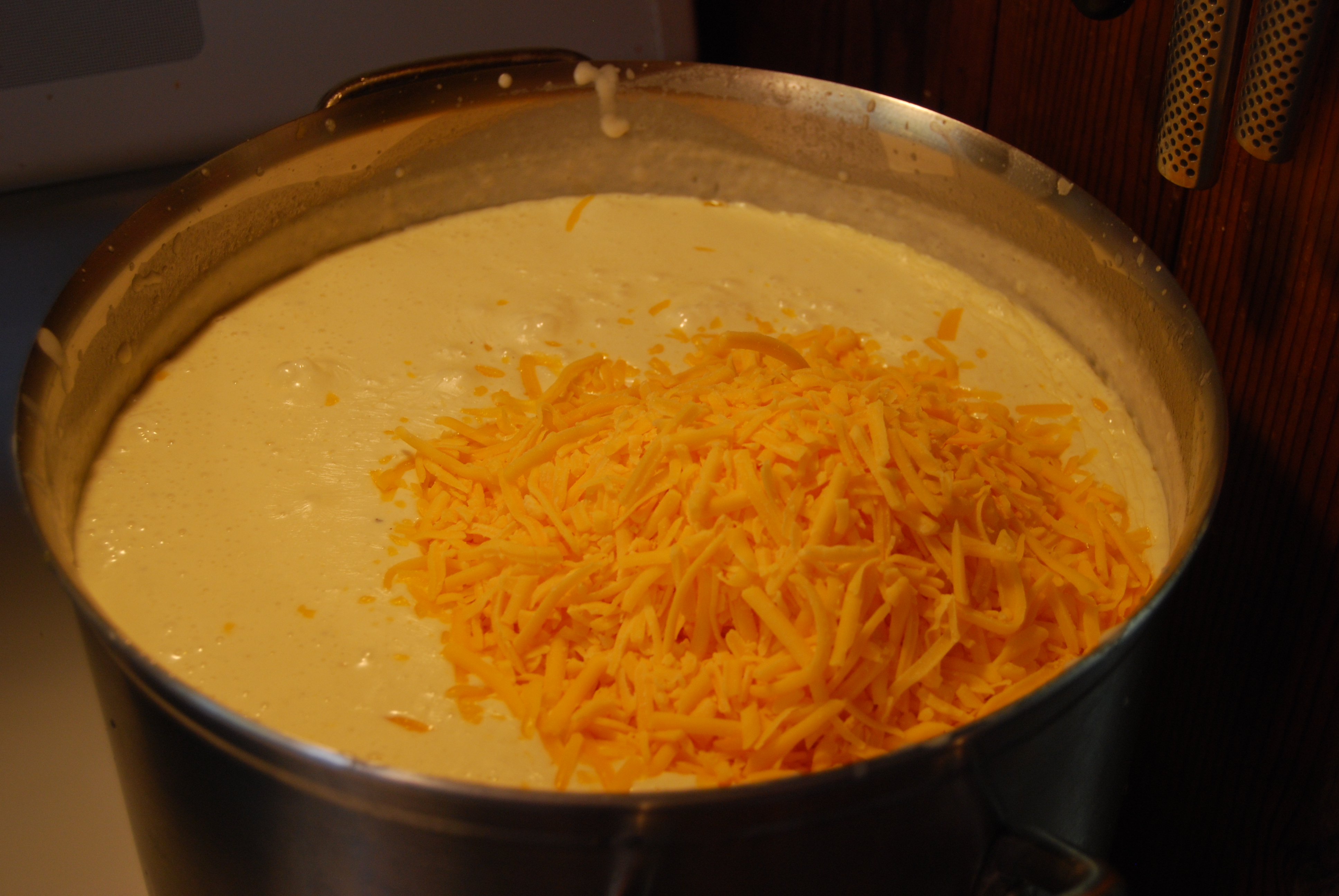 I then pour 4-1/2 gallons of 40% milk fat heavy cream into the pot. Do not use anything less in fat content or your sauce will never thicken into that silky consistency that makes a great mac-n-cheese sauce.