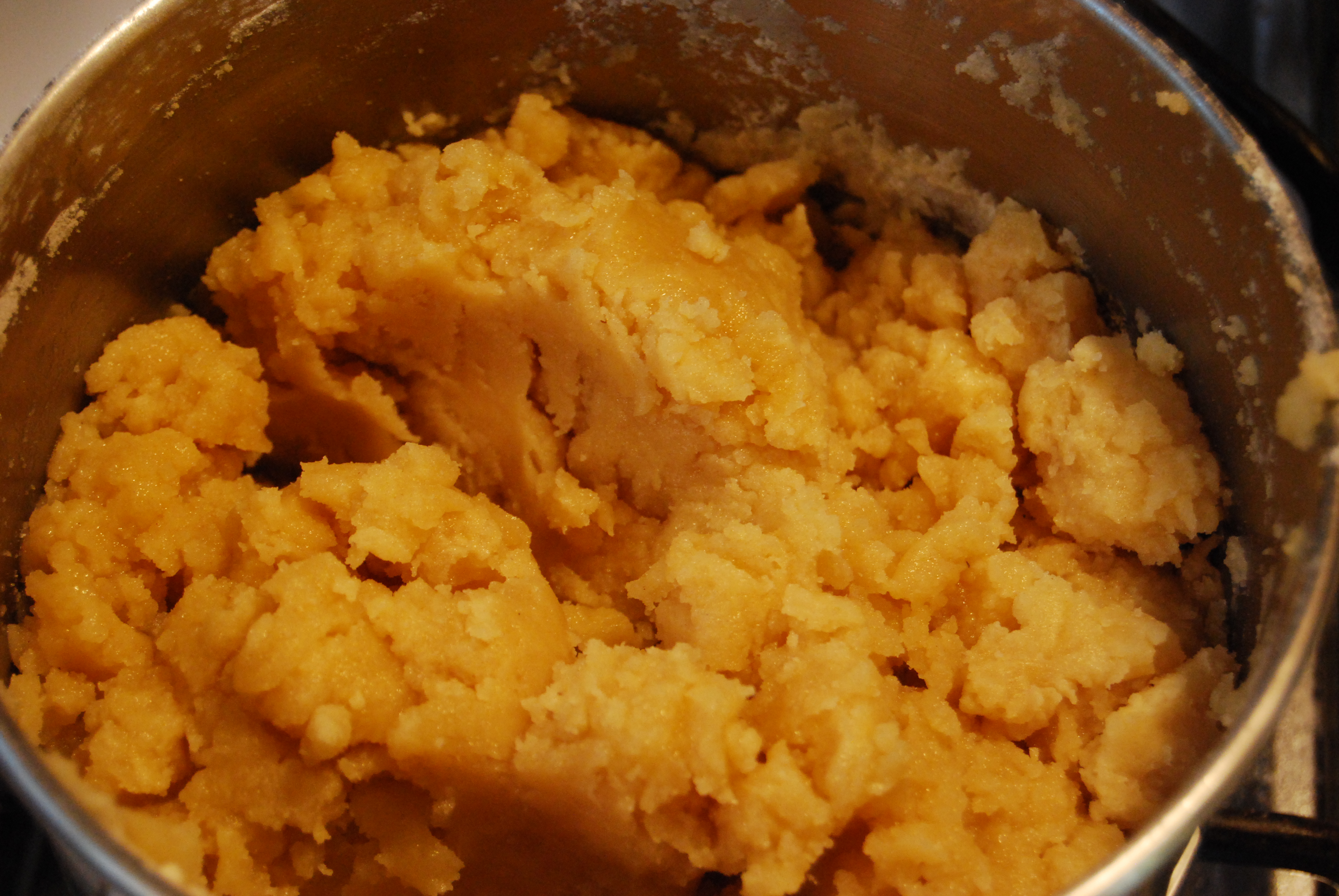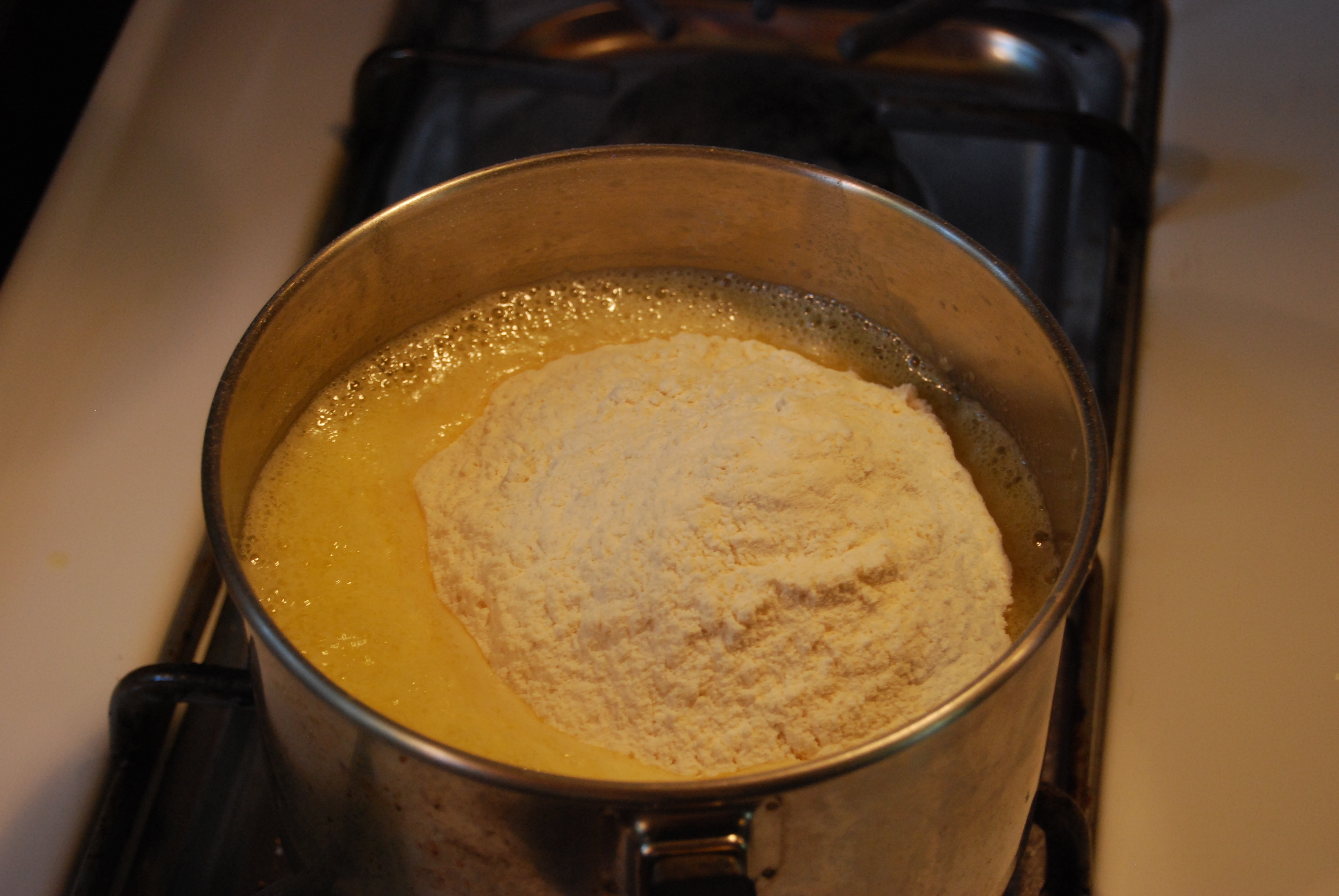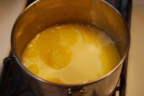 The next step is to thicken the sauce. I create a roux. It’s equal parts butter and flour. You melt the butter and fold in flour and stir on low heat. The tell-tale sign of a roux finishing is that it smell like popcorn. Yes, popcorn. Here are the steps. Melt butter, add flour and stir on low heat until it start bubbling. If you do not continue to stir it will burn.