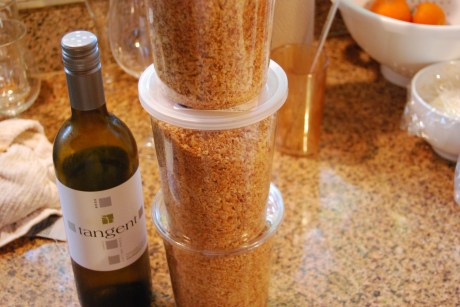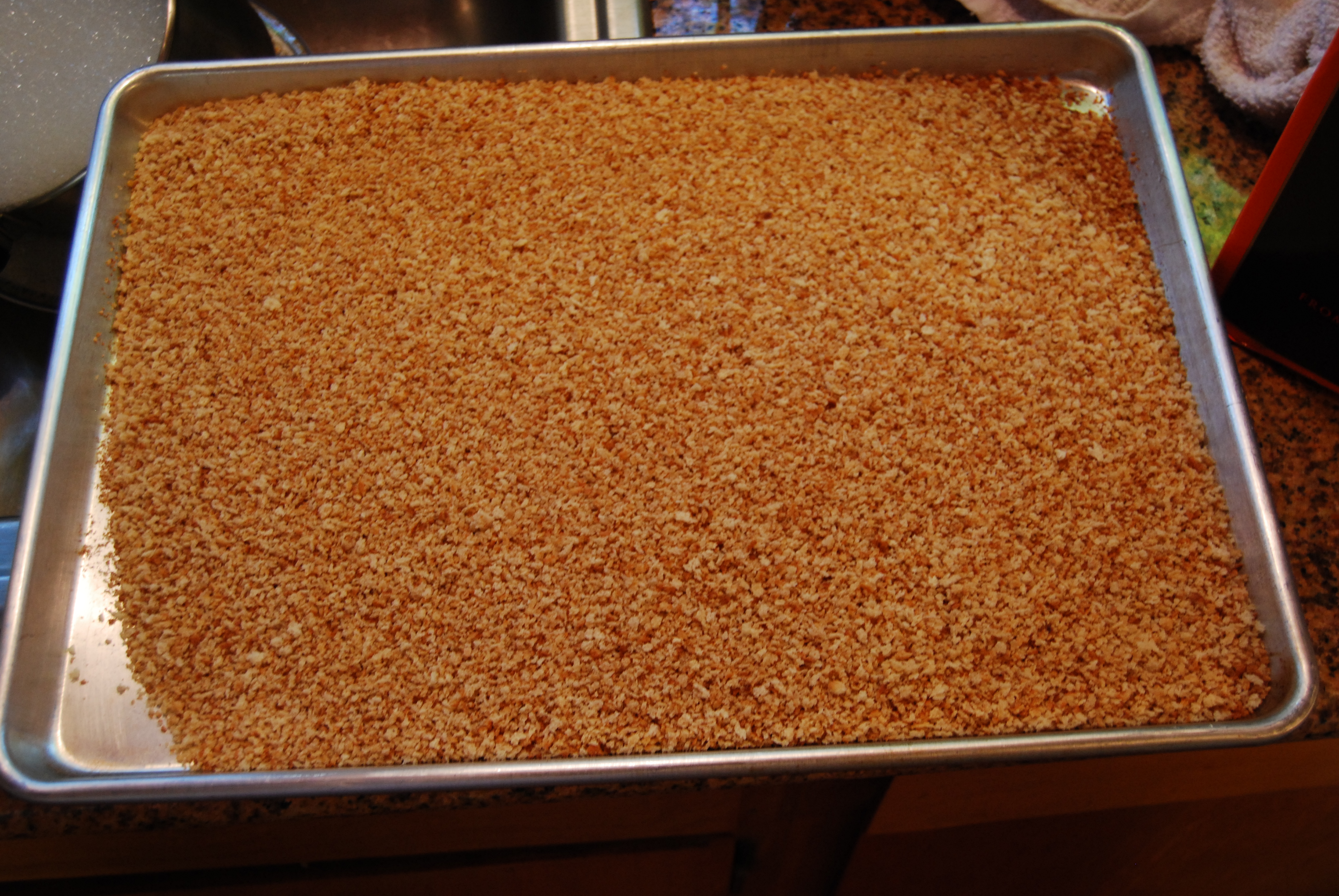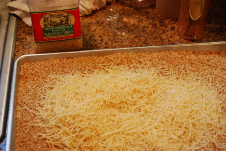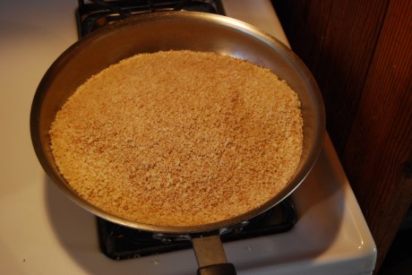 The garnish I use is a Parmesan and toasted bread crumb mixture. I toast the panko bread crumbs on the stove in a large saute skillet. You can purchase these bread crumbs at Whole Foods. Here is the process on how to do this. Place the bread crumbs in a skillet and toss every few seconds on a high burner until the bread crumbs are browned. Transfer to a sheet tray to let cool. When cool, fold in Parmesan and then transfer into deli-cups which can be purchased at Cash-n-Carry.