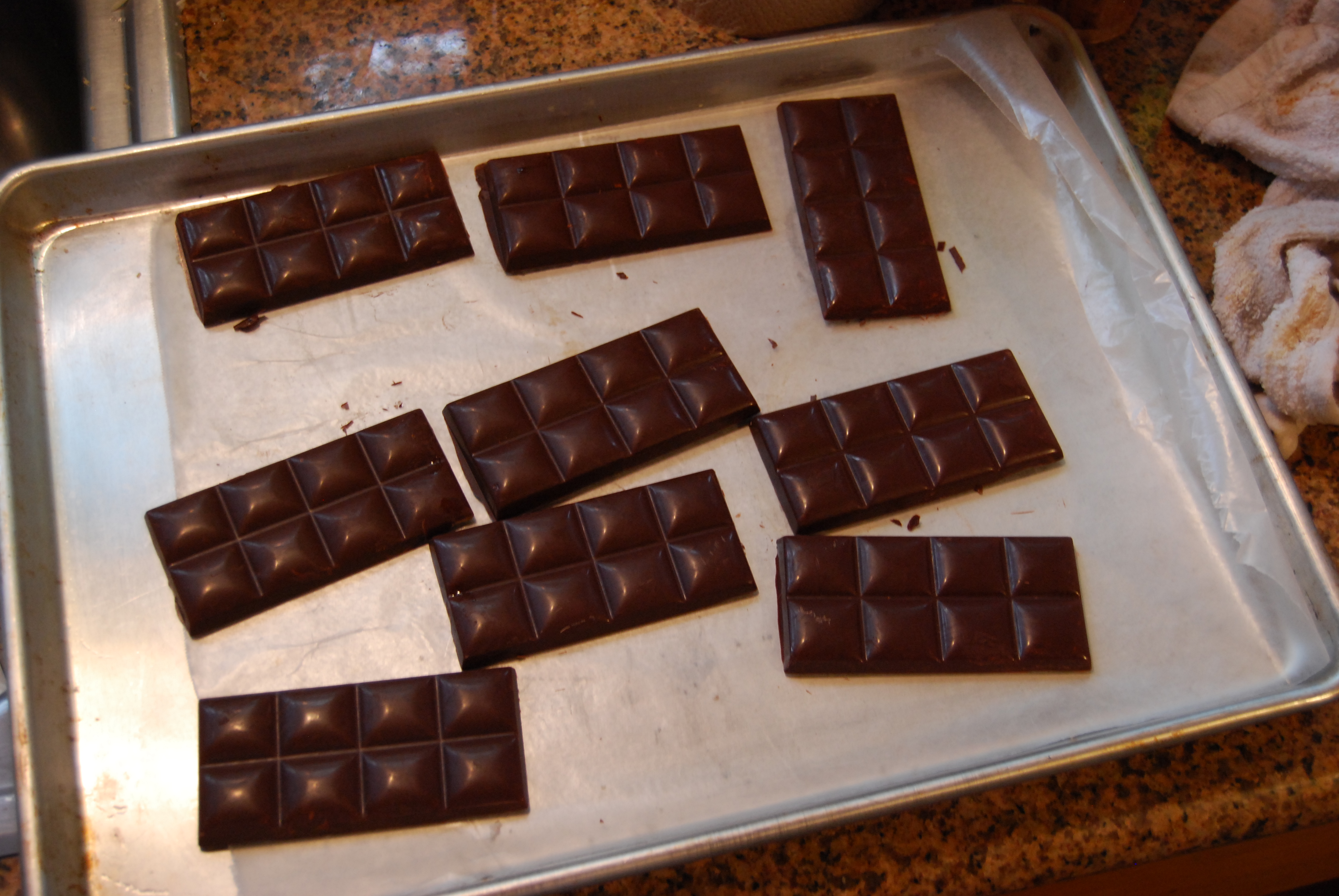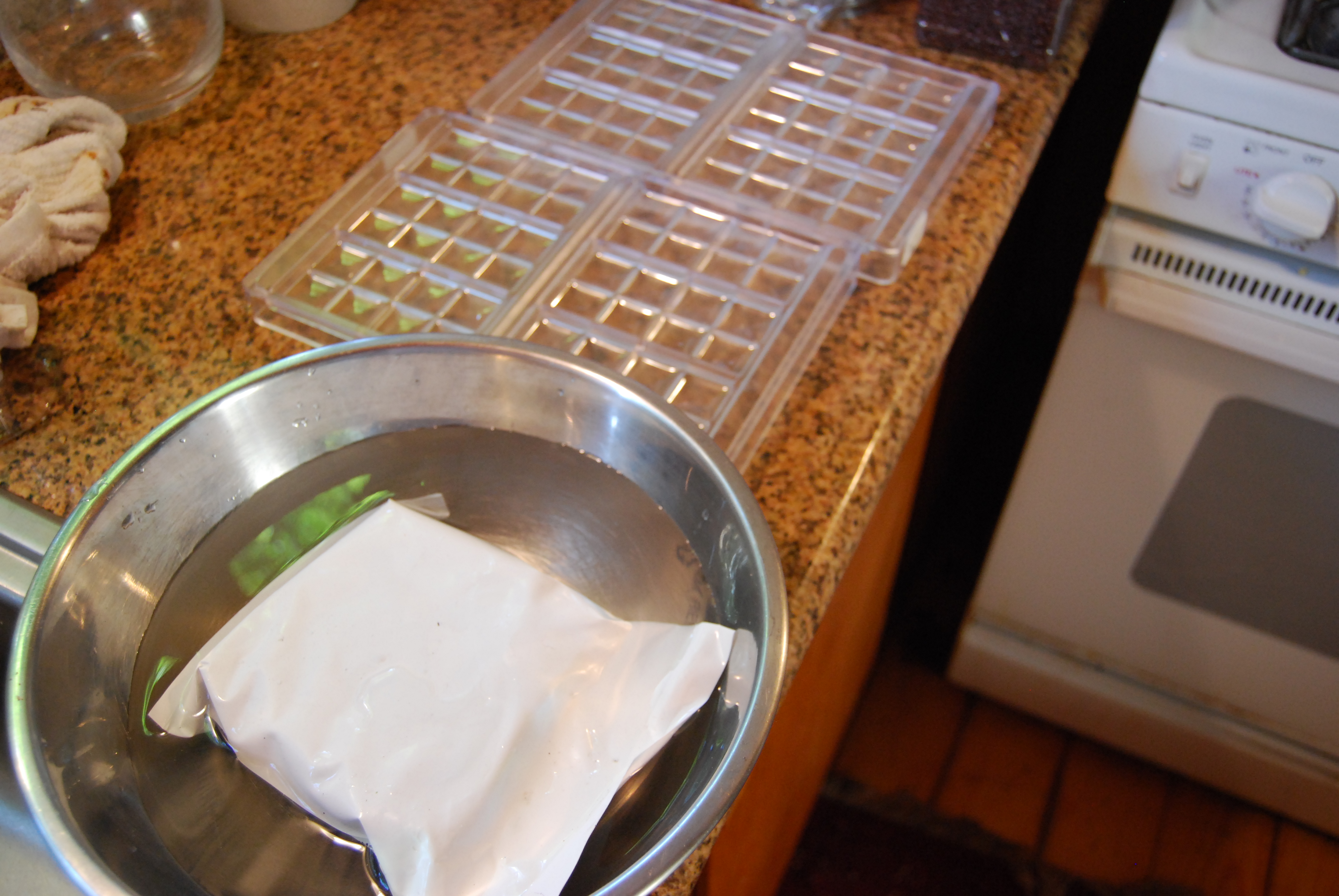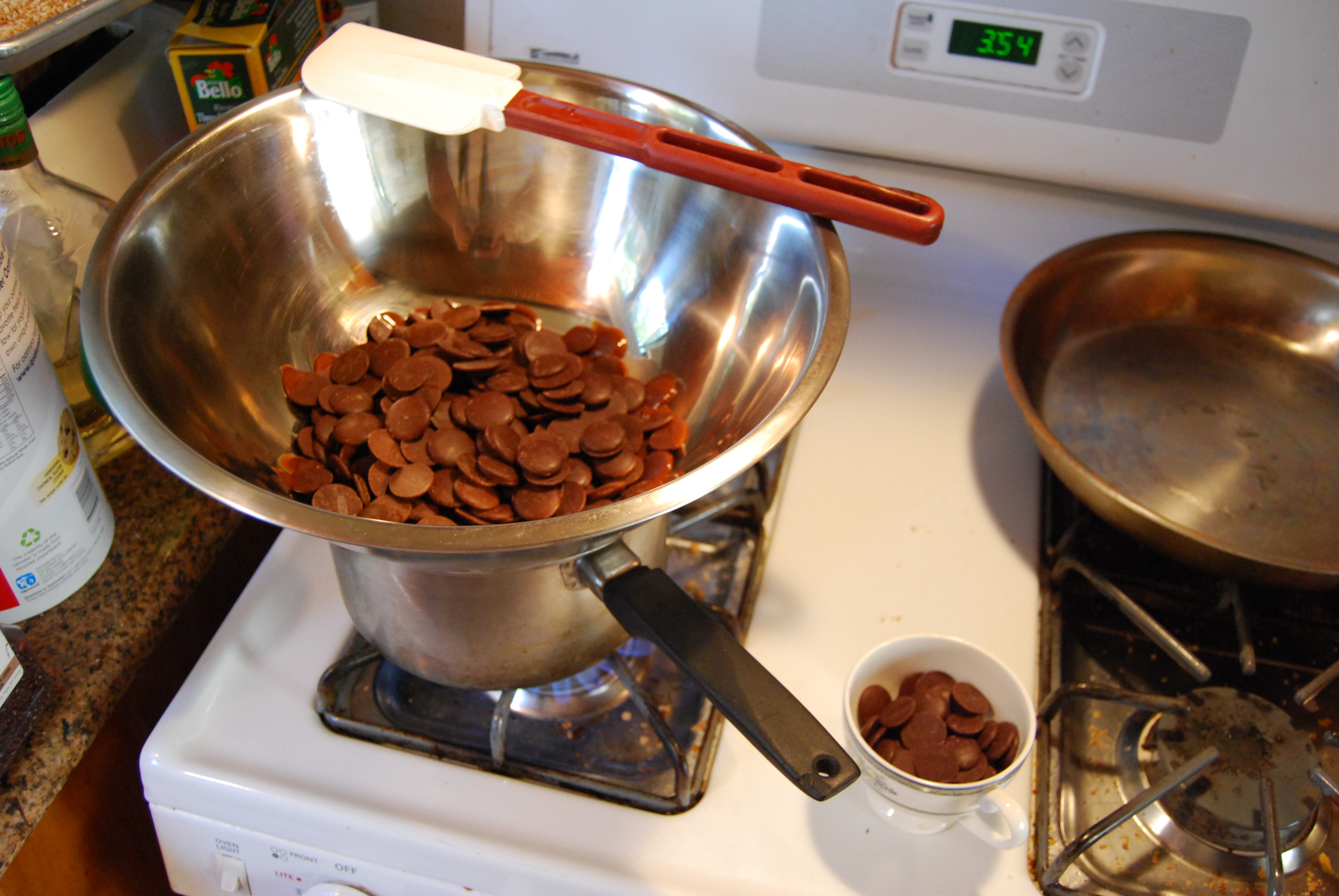 I sell chocolate pop rock bars at the market. We tried a similar bar at Molly Stones and I thought our product would be better. We start by tempering chocolate. You place a stainless steel bowl on a pot of simmering water. I place 2 cups of E.Guittard 61% chocolate in the bowl. I reserve about 1 cup of the chocolate to cool it down.