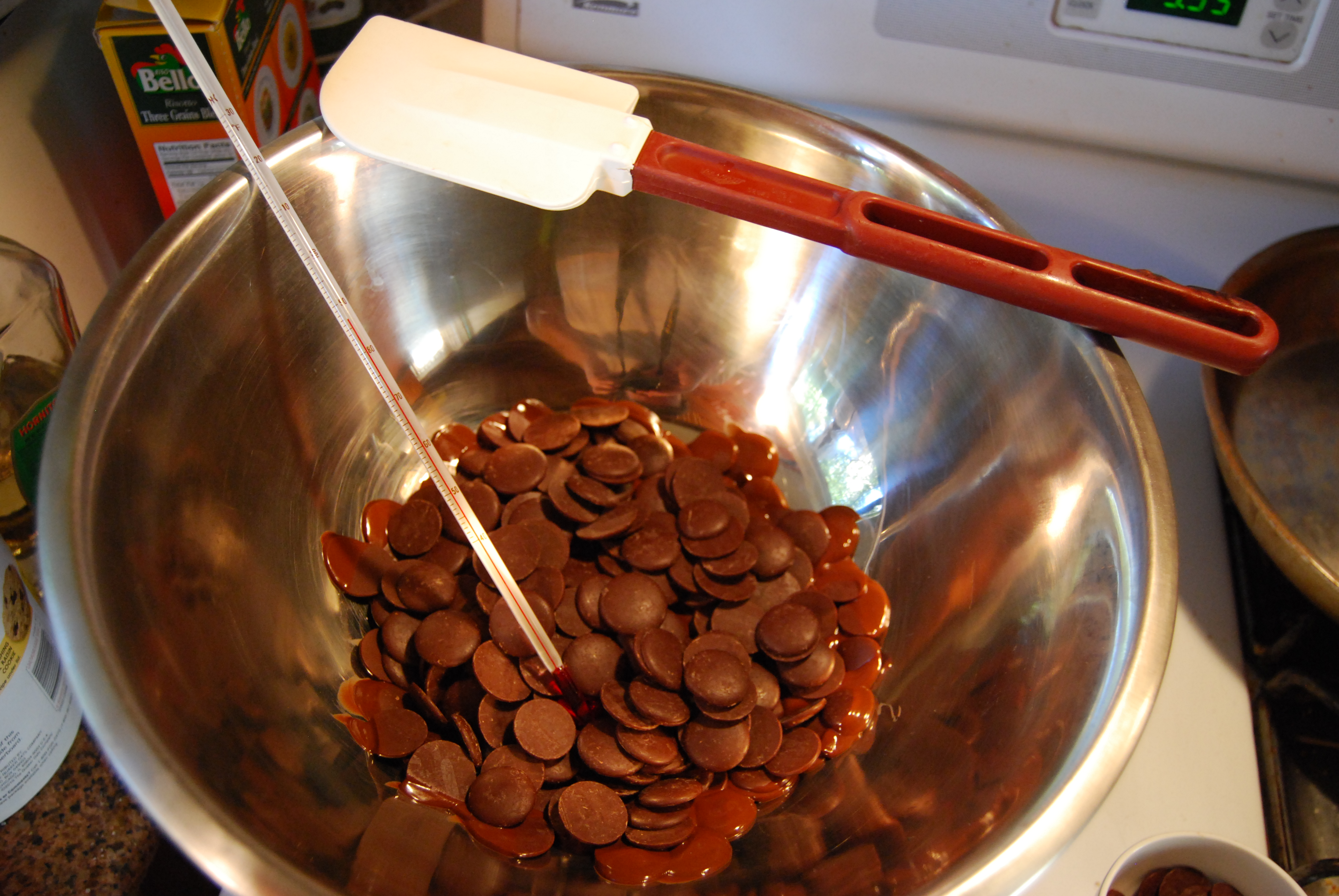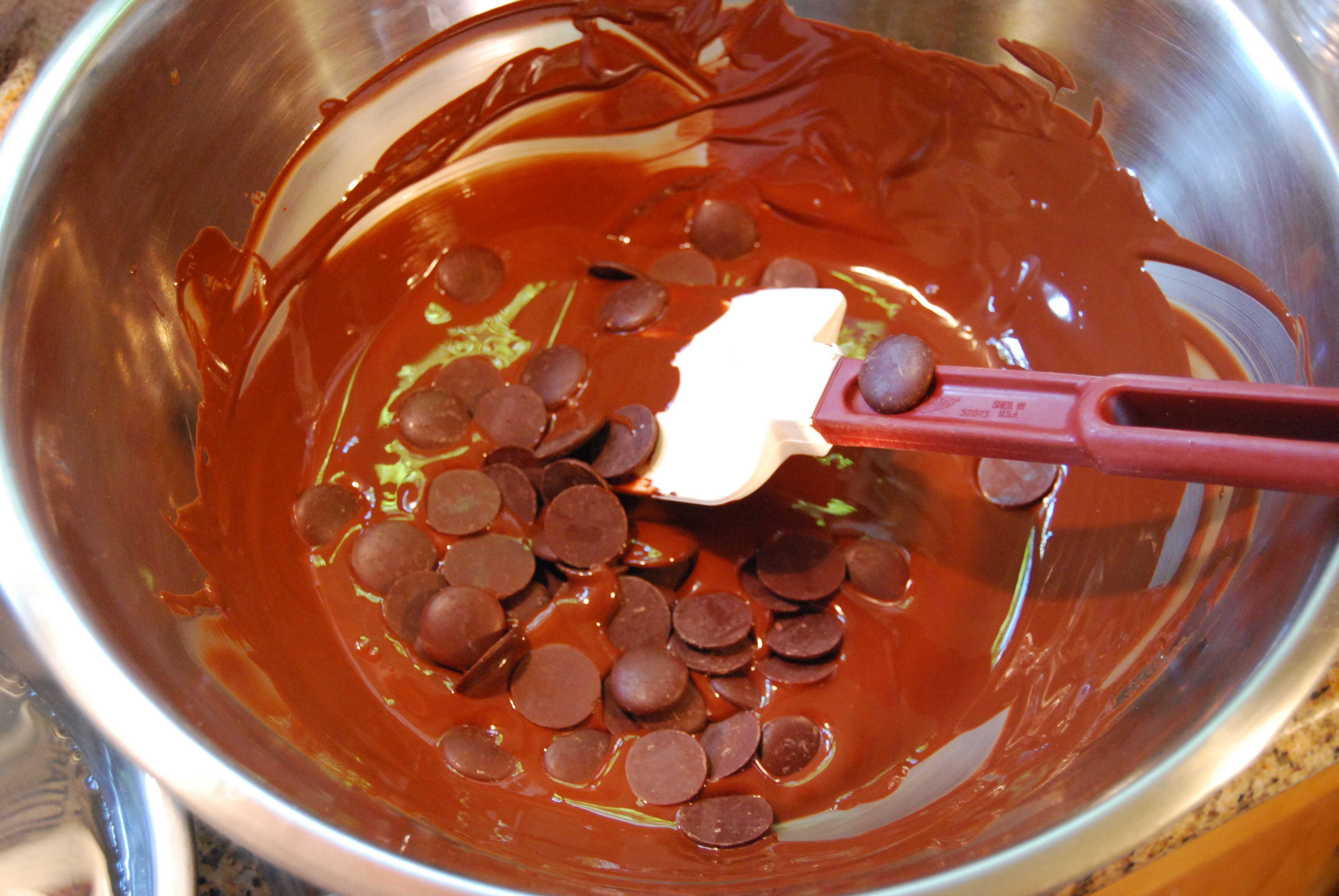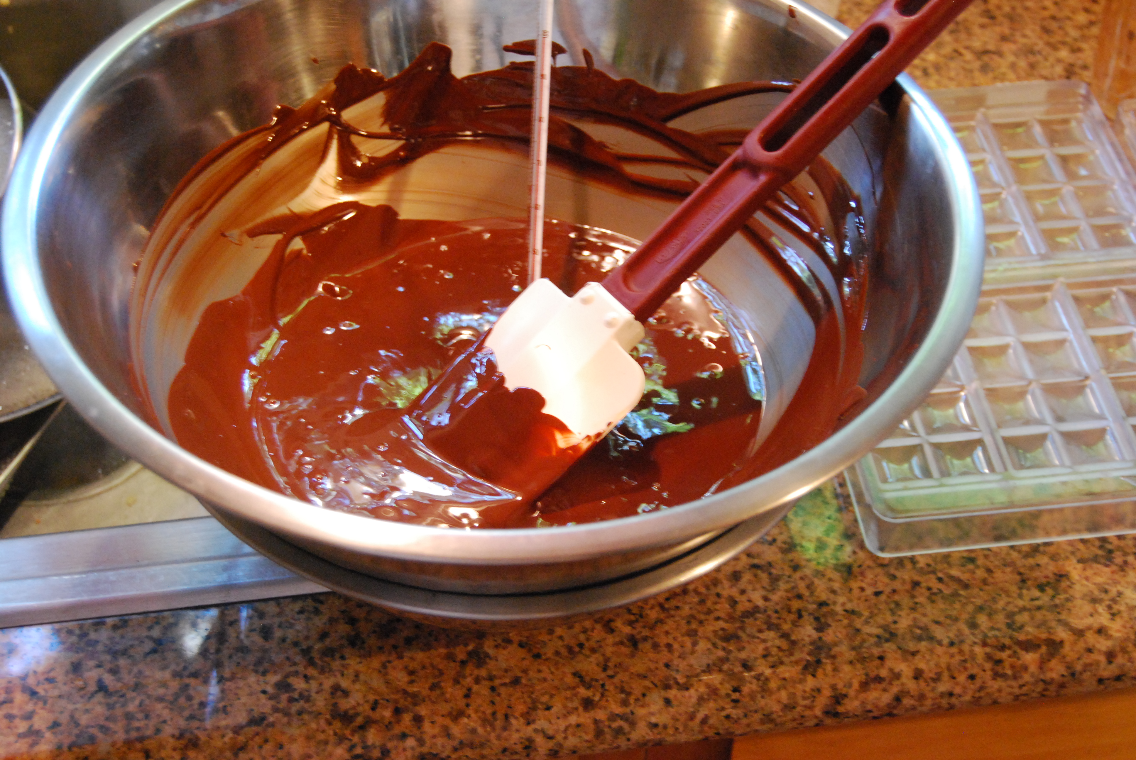 You will need a chocolate thermometer. The target temperature for your melted chocolate is 116-118 degrees. If you reach 120 or higher, your chocolate will be ruined and you will have to start over. You will also need a high temp rubber spatula that is available at Economy Restaurant Supply.