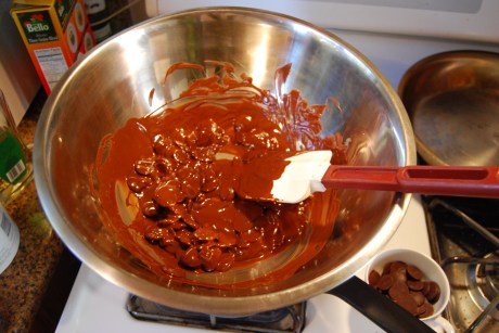 When the water comes to a boil, turn off and start melting your chocolate. Make sure you keep stirring and scraping with your spatula so it does not scorch.