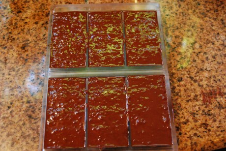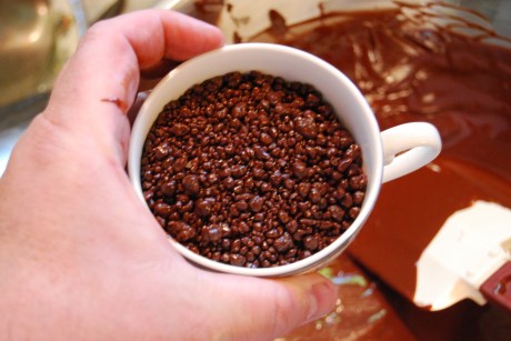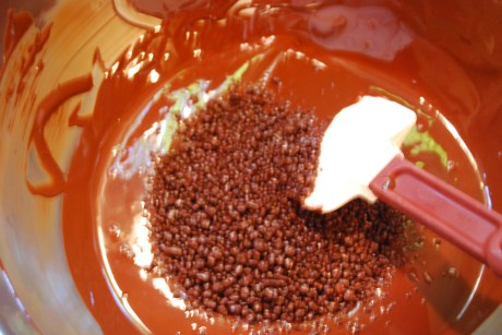 Once your chocolate has reached 80 degrees, put the bowl back on the hot water and bring the chocolate back to 91 degrees for dark chocolate. At this point is when I fold the chocolate pop rocks into the chocolate. Any hotter, it will actually activate the pop rocks thus ruining your result.