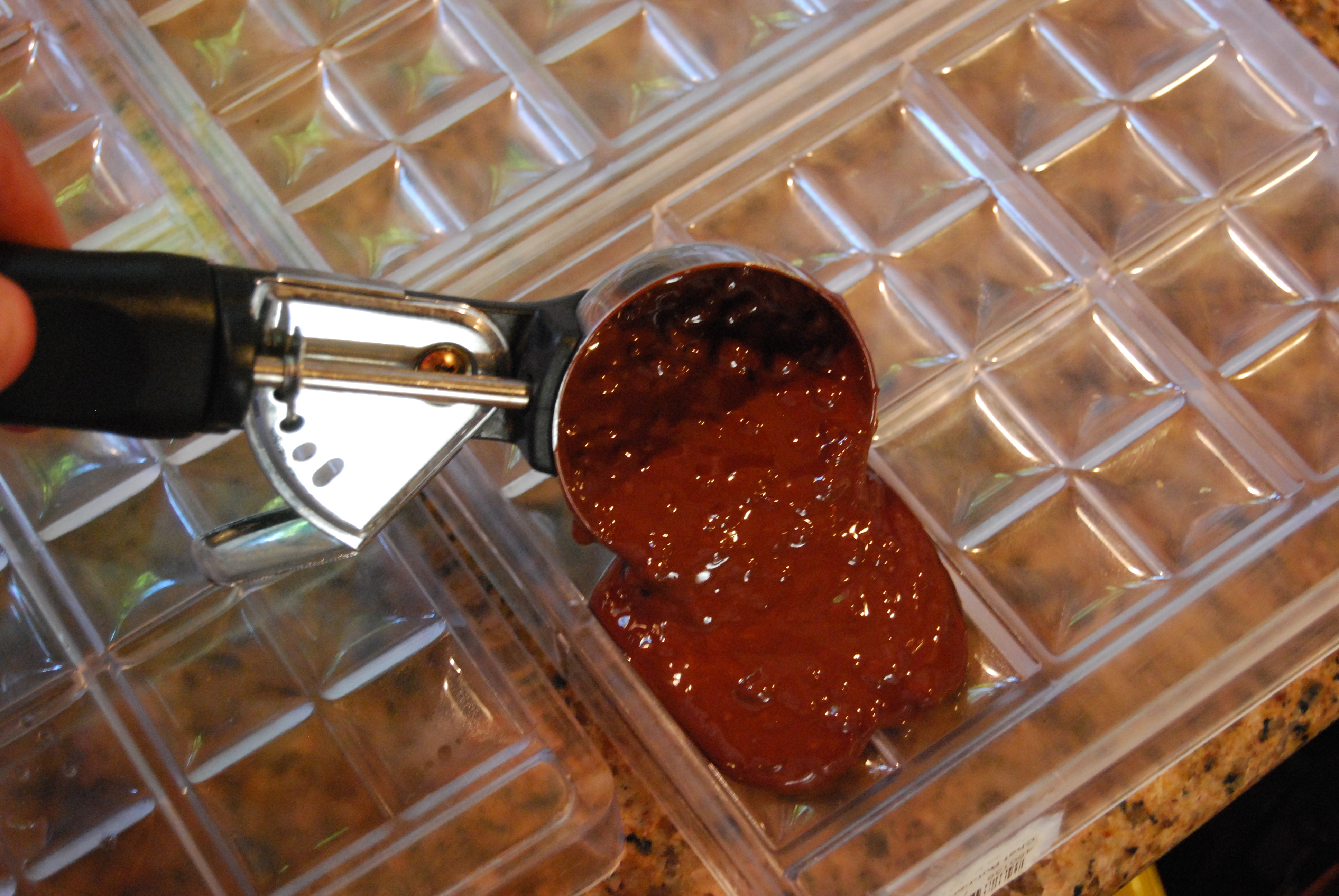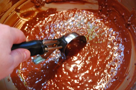 I use a 2 oz ice cream scoop to transfer the mixture to chocolate molds.