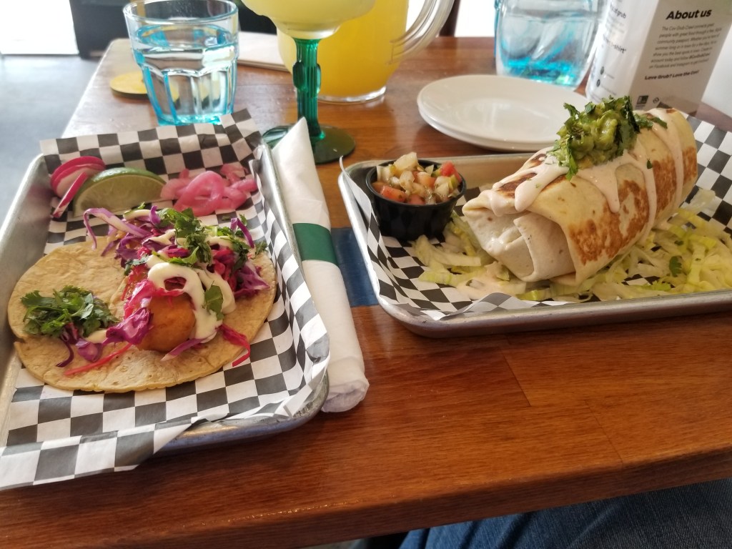 My first visit, I opted for a chicken burrito and a fish taco as seen in the pictures below. The flavors are balanced, the plates were nicely designed, the fish was crispy, seasoned well, and hot! My only gripe is when you put wet ingredients like toppings for the burrito, you are then obligated to eat with a knife and fork which causes the paper that is lining the serving tin to shred throughout the course of the meal, thus leaving you with having to sift through the food you are eating to discard the shredded paper.